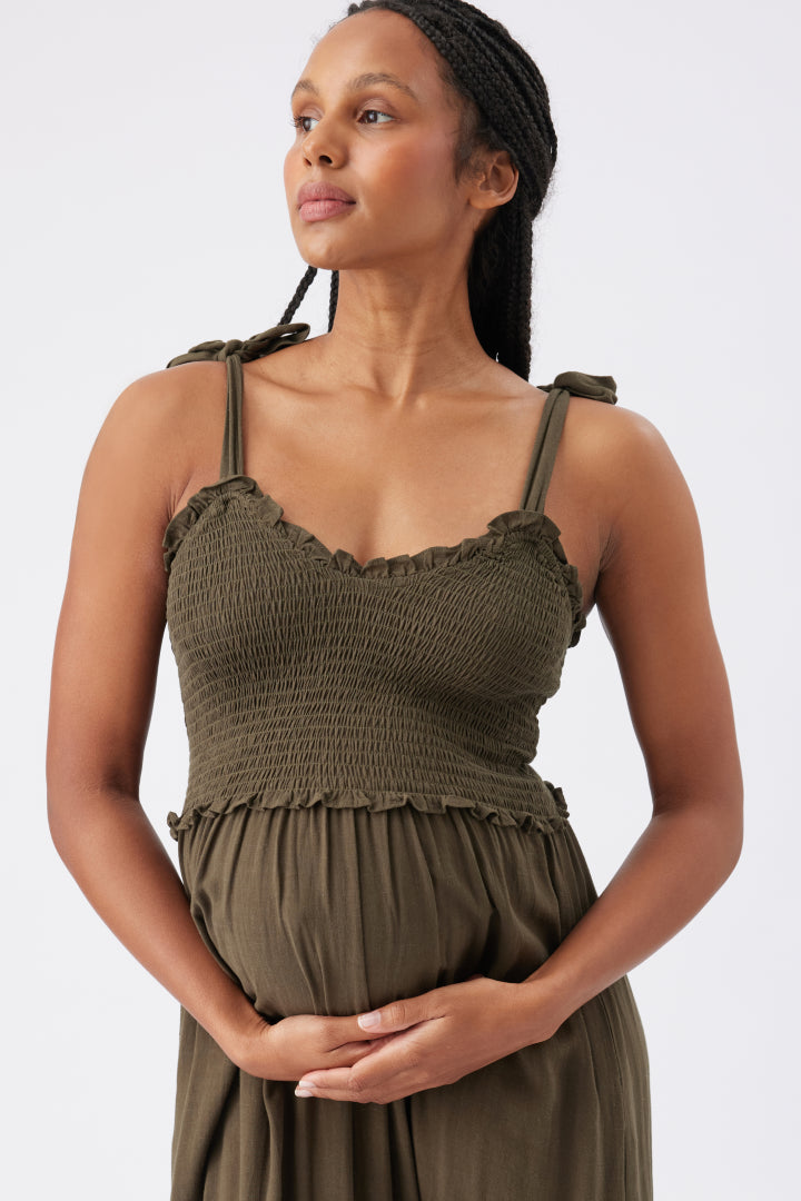 - Shirred bodice and side seam pockets