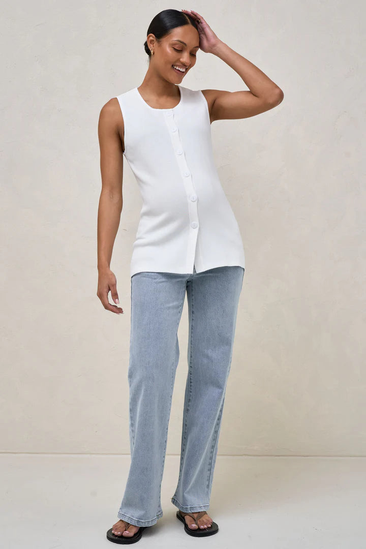 A vest tank featuring buttons for easy nursing access. It's crafted from a signature light-weight Milano blend and effortlessly transitions from work to weekend.