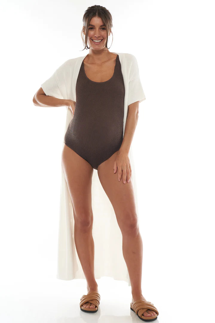 With its flattering silhouette and design, this maternity swimsuit effortlessly combines fashion and function. Crafted from a soft and stretchy crinkle fabric. This one-piece design offers full coverage and support.