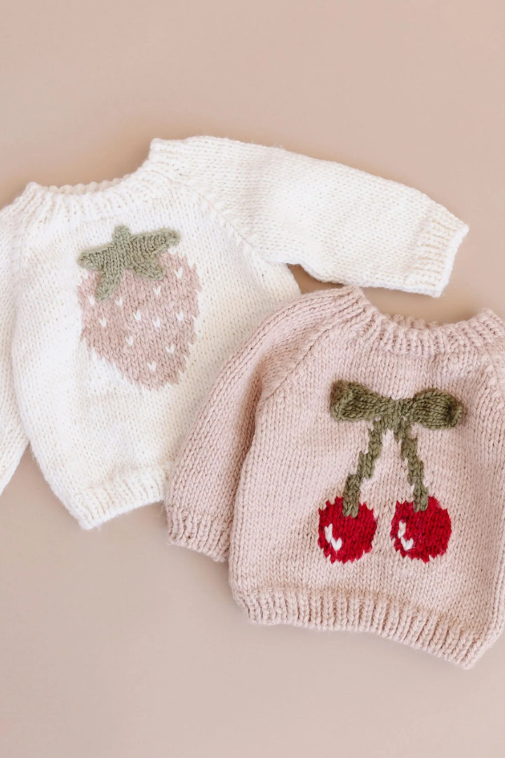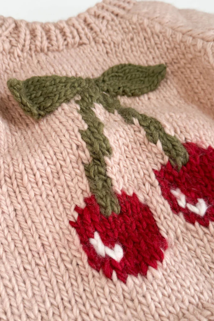 Add a pop of color. This Blush Pullover features a pair of cherries with knitted appliqué leaves in Moss.
