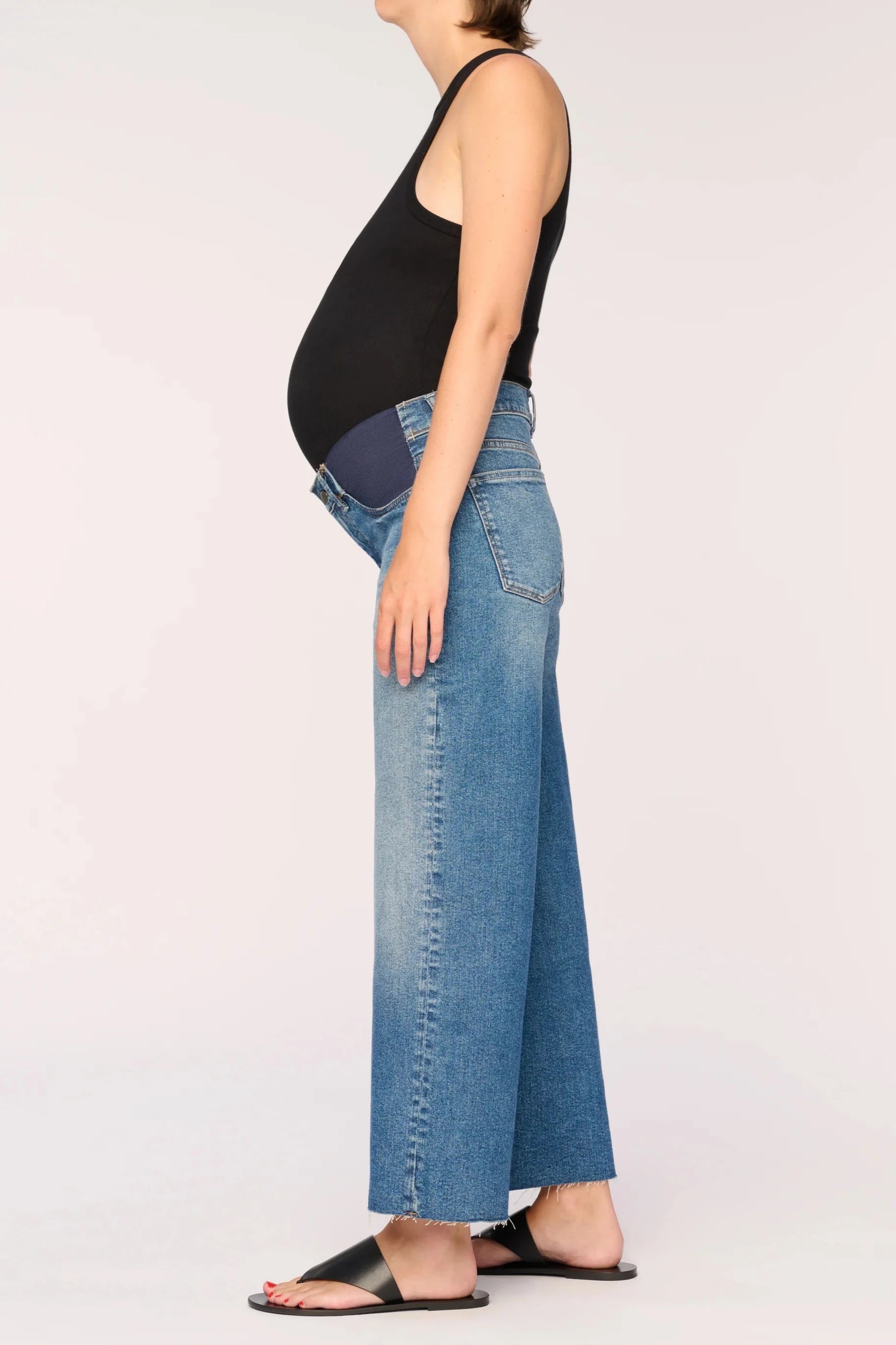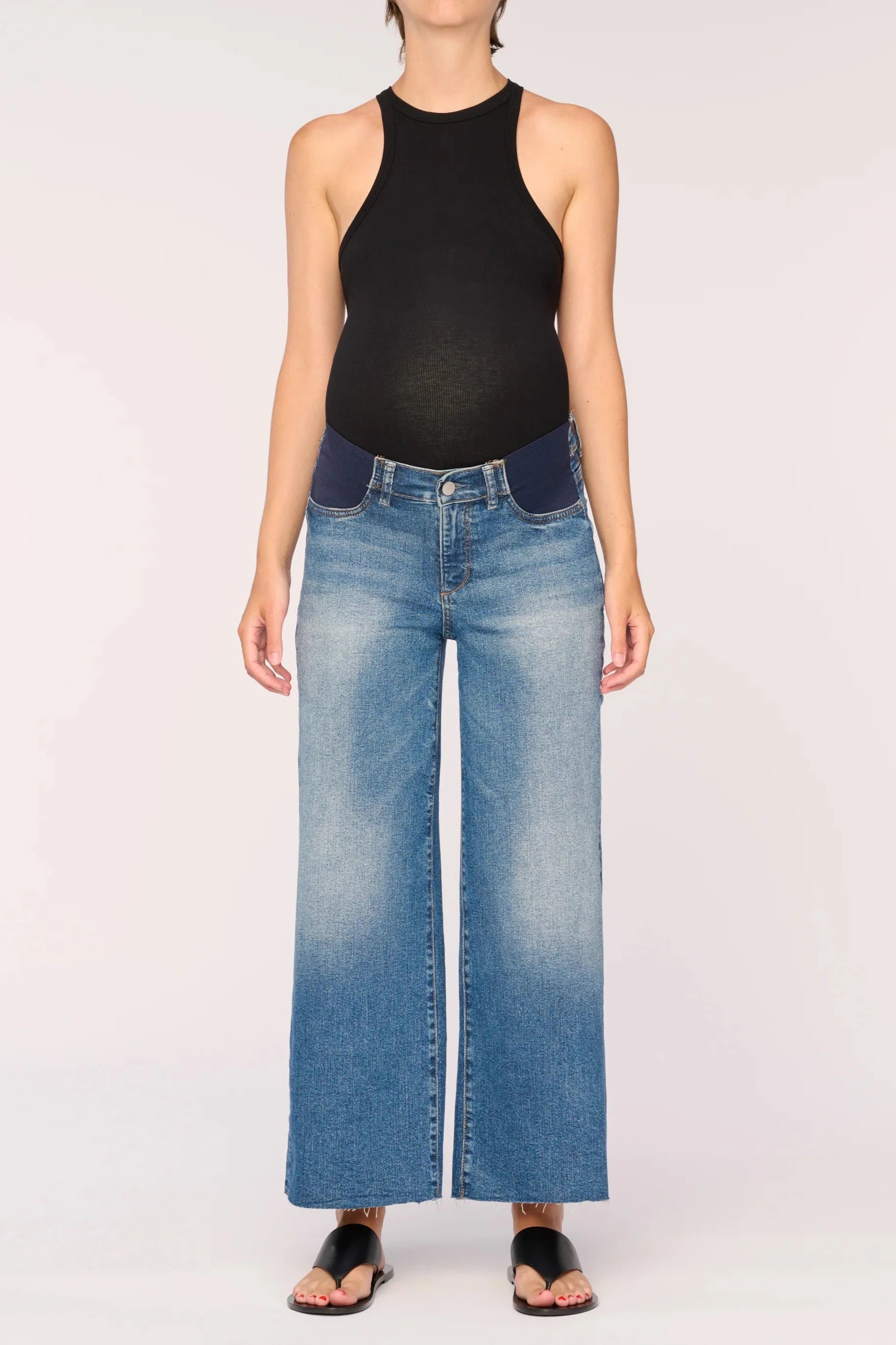 Hepburn is fitted through the waist and seat, tapering outward from the thigh for a wide leg that hits above the ankle. It features stretch paneled pockets for ultimate comfort through every trimester.
