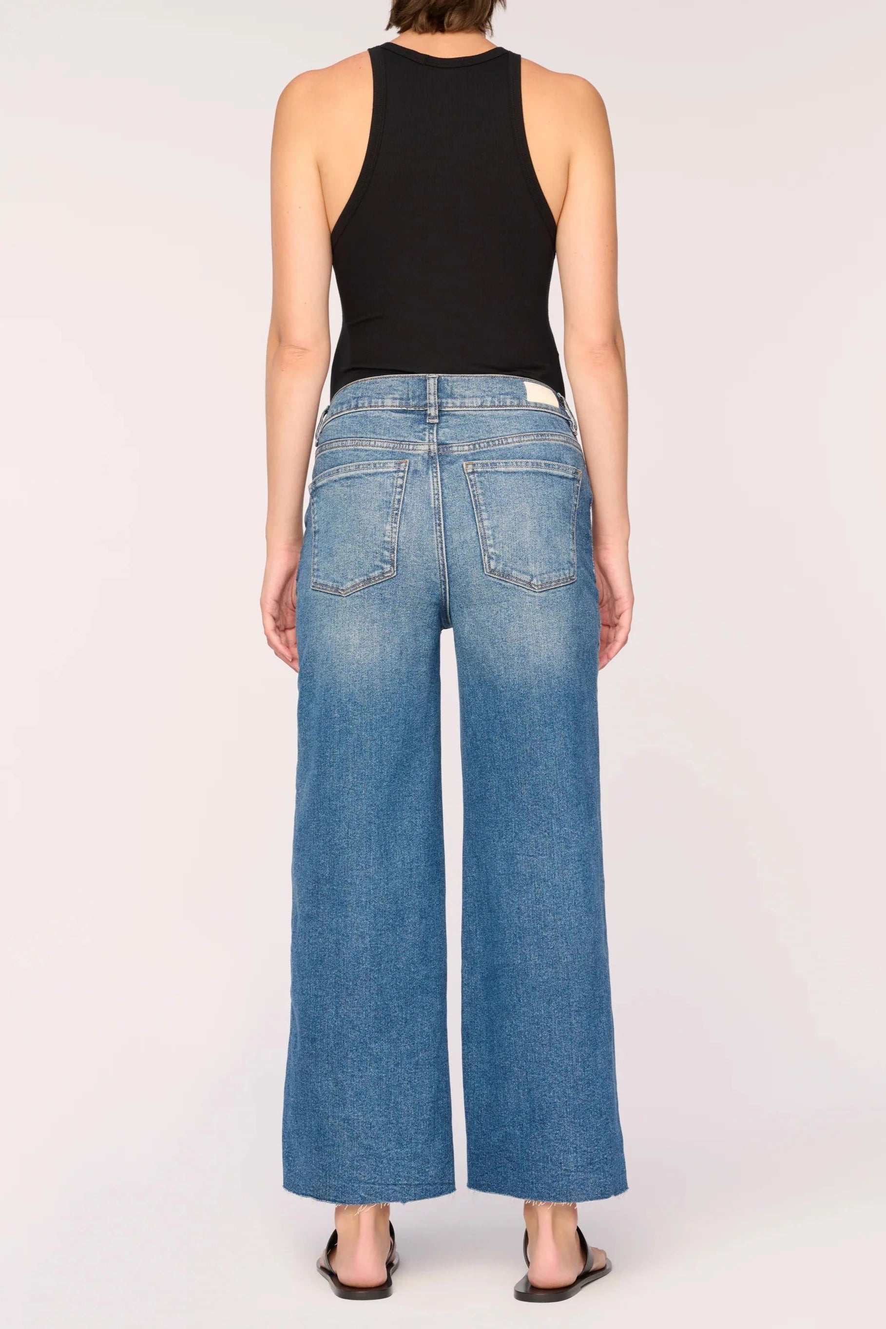East Lake is a vintage inspired mid-indigo wash with an authentic worn-in look. It features brushed silver hardware, multi-colored stitching, raw hem and an ecru back patch.