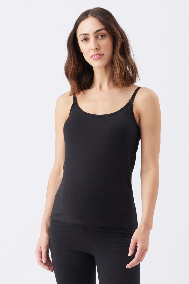 Made from a buttery soft blend of organic cotton and elastane, this cami is not only comfortable and breathable, but it can be worn any time, any day. Perfect as a base layer, for sleep, and for daily wear. Featuring adjustable straps, a built-in shelf bra with removable cups, and clips for easy nursing access, this cami is ideal for pregnancy through to breastfeeding.