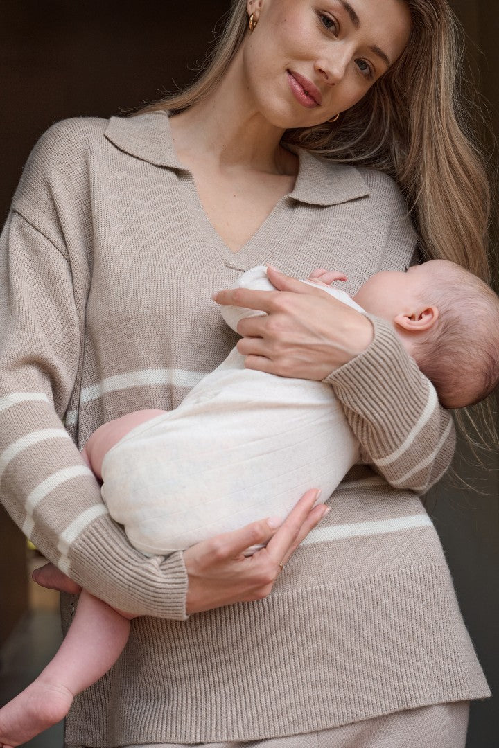 The Lori Nursing Knit by Ripe Maternity features a slouchy, relaxed fit constructed from a warm, yet breathable blend of polyester, acrylic, nylon, and wool. This softly textured knit sweater with its modern polo collar leads to a deep v-neckline and split side seams with snap closures for easy nursing access. Whether you're lounging at home, running errands, meeting friends, or looking for that perfect breastfeeding jumper for your baby to snuggle into, this will be your go-to knit.