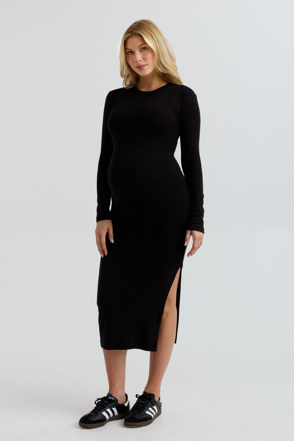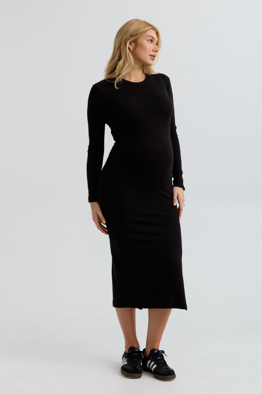 Embrace your curves with the Scarlett Rib Maxi Dress. Crafted from our ultra-soft baby rib fabric, this dress provides impressive stretch and retention. The bodycon fit gracefully hugs your bump, and the side slit allows for easy movement. Pair it with sneakers for a casual vibe or elevate your look with boots for your next outing.