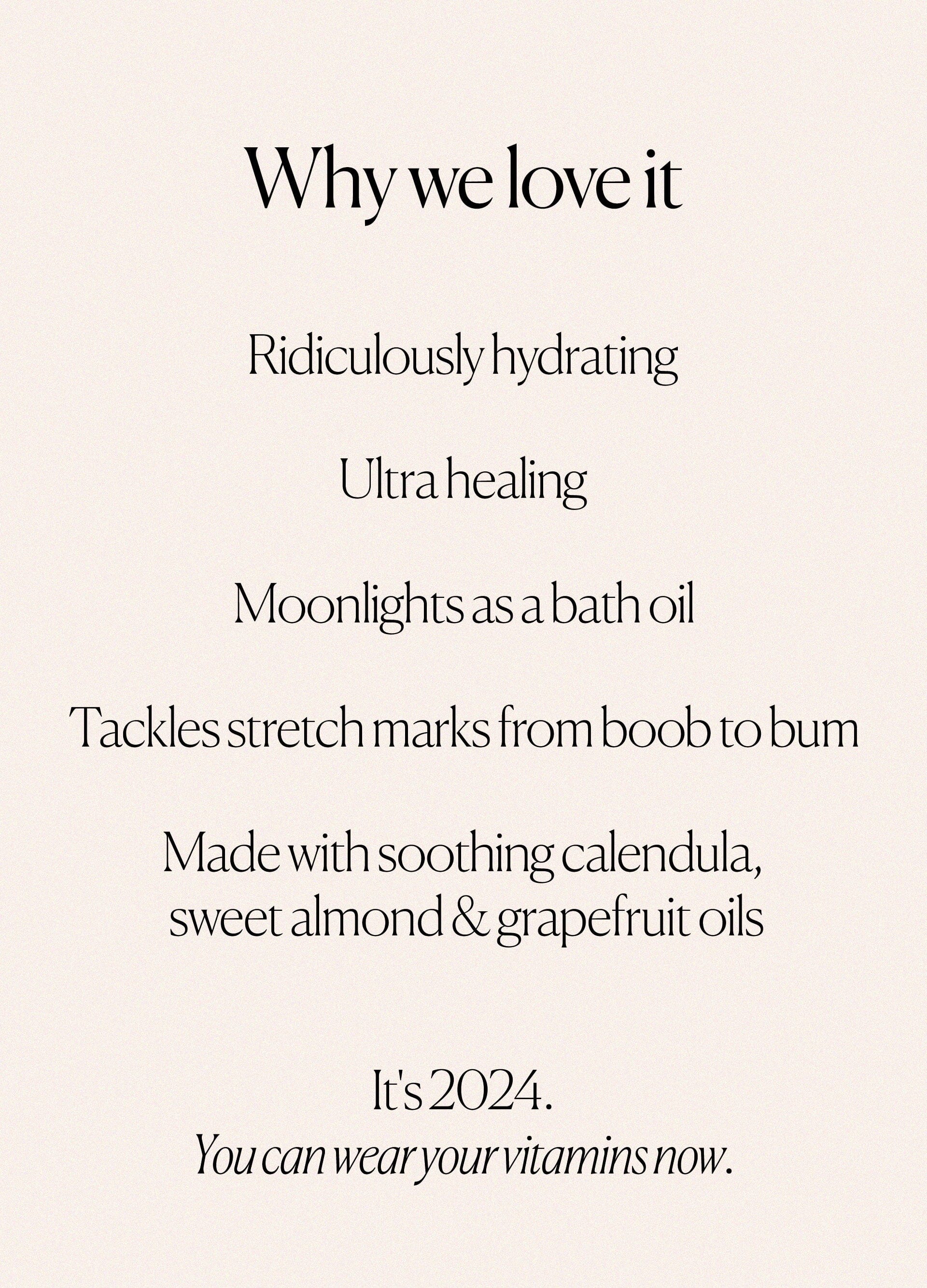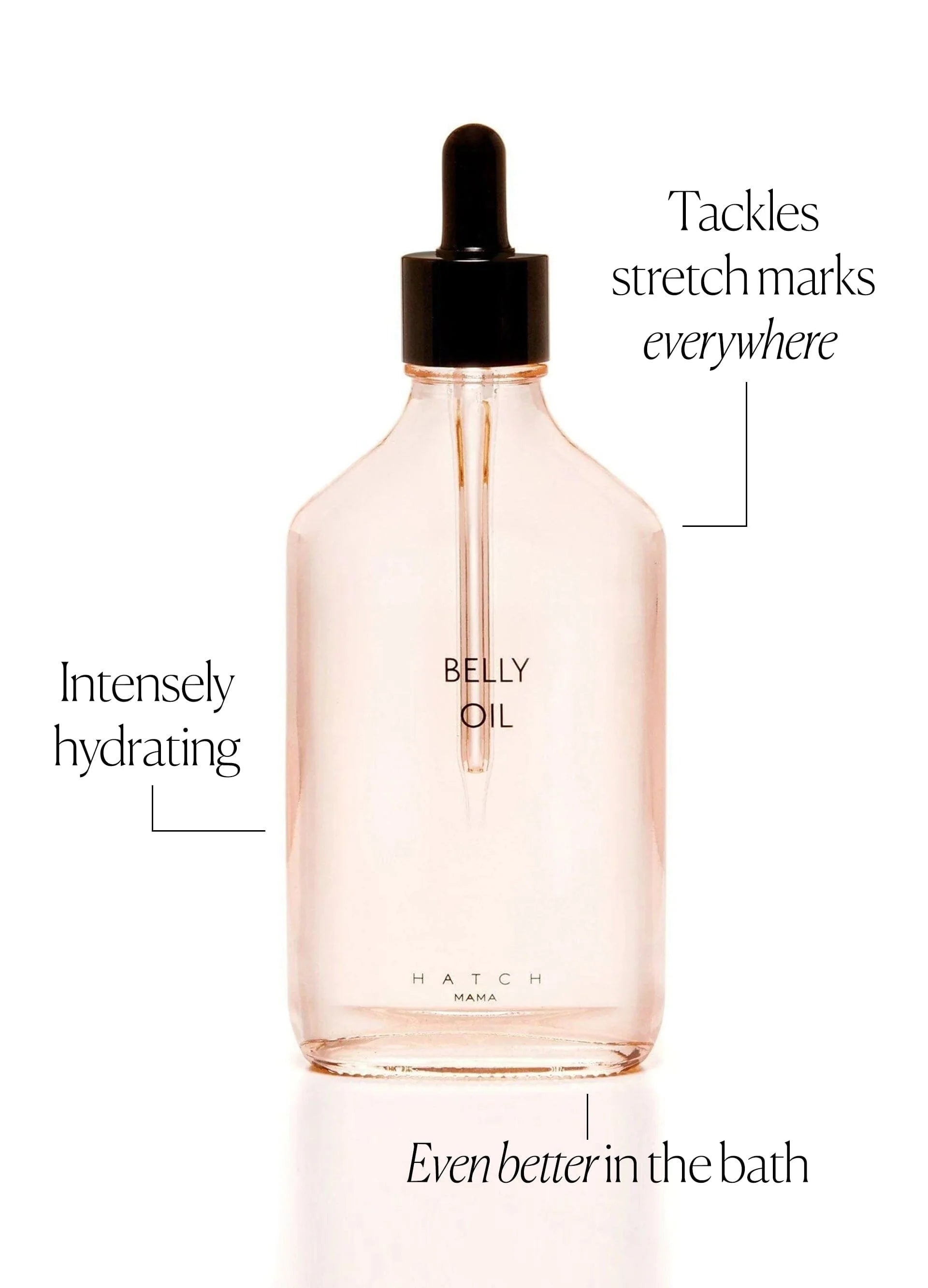 This quick-dry botanical belly oil intensely hydrates + reduces the appearance of stretch marks and scars.