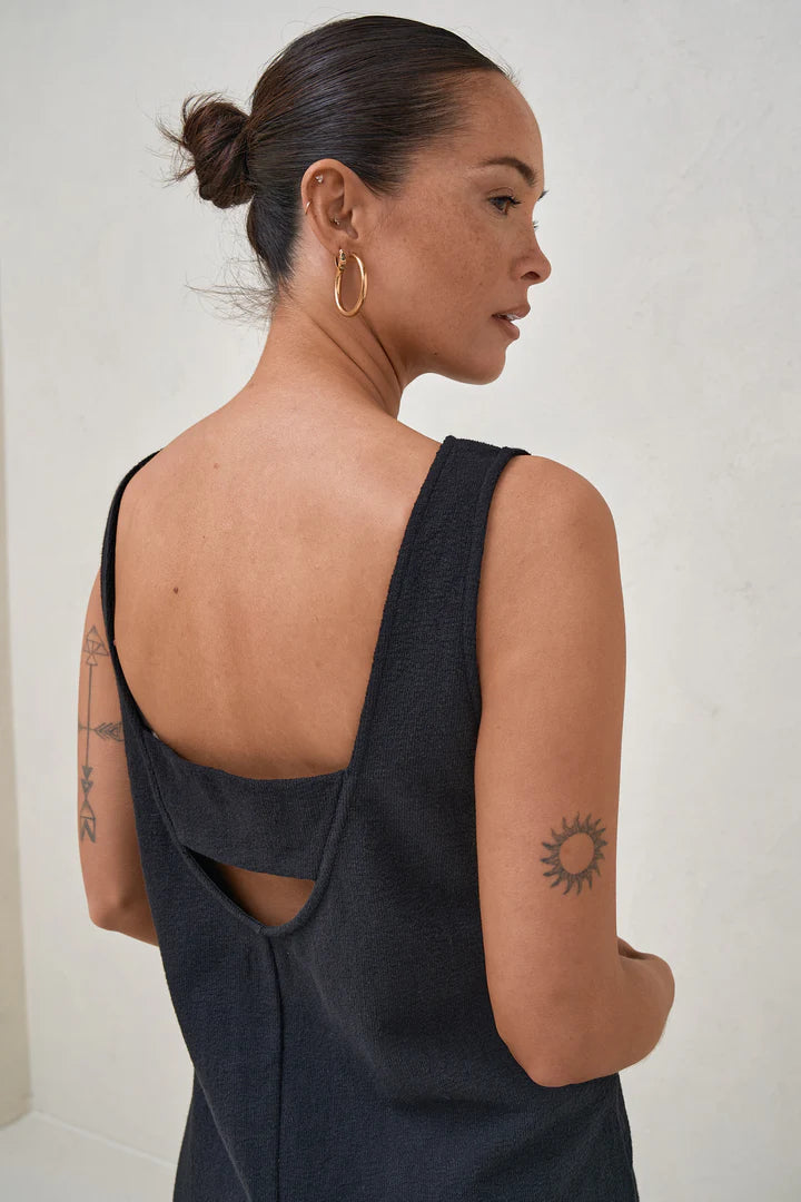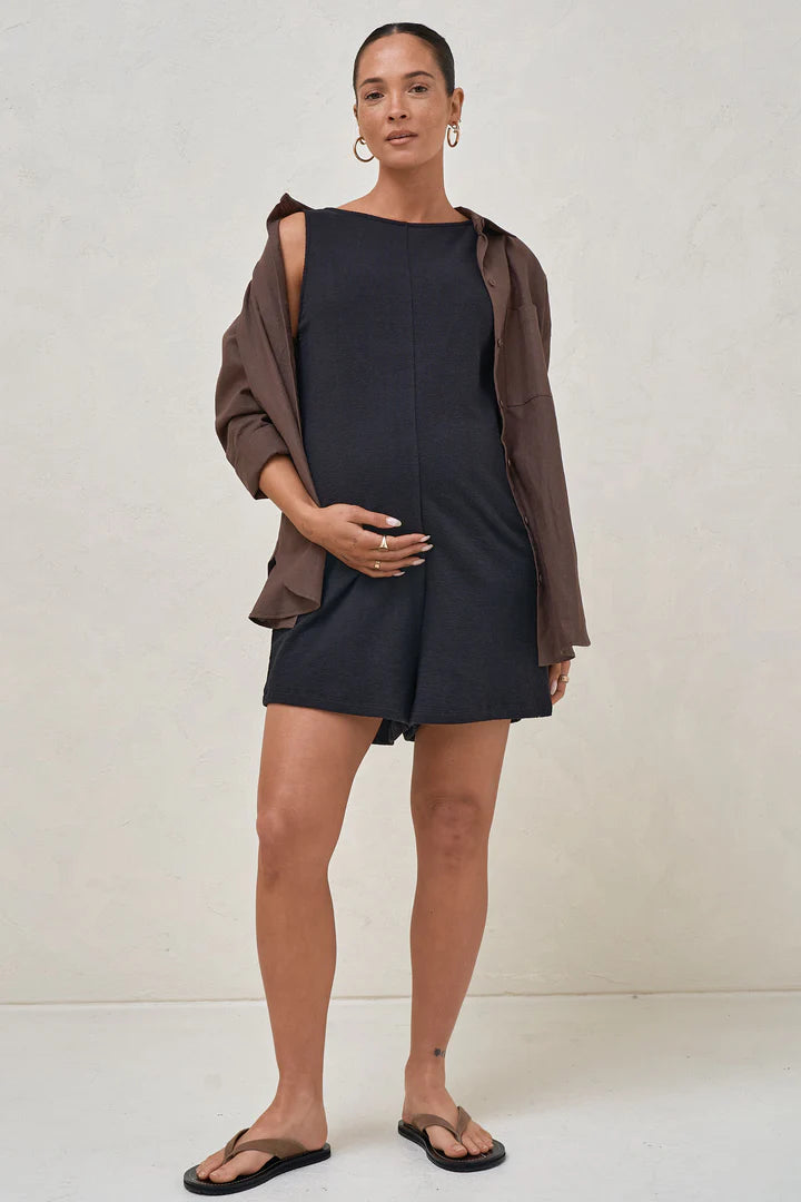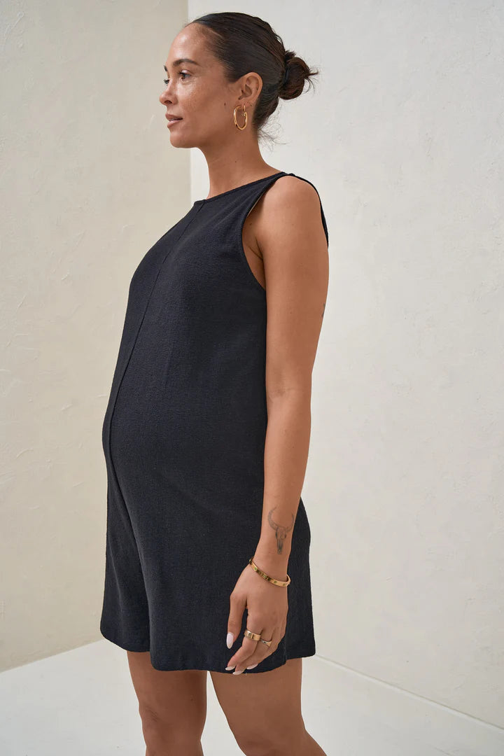 An effortless jumpsuit that ticks all the boxes. Made in a textured stretch jersey for superior comfort, it looks structured yet relaxed at the same time. With design details like an bra friendly cut out and discreet side zips for nursing access, makes this the perfect all-occasion maternity and nursing playsuit.