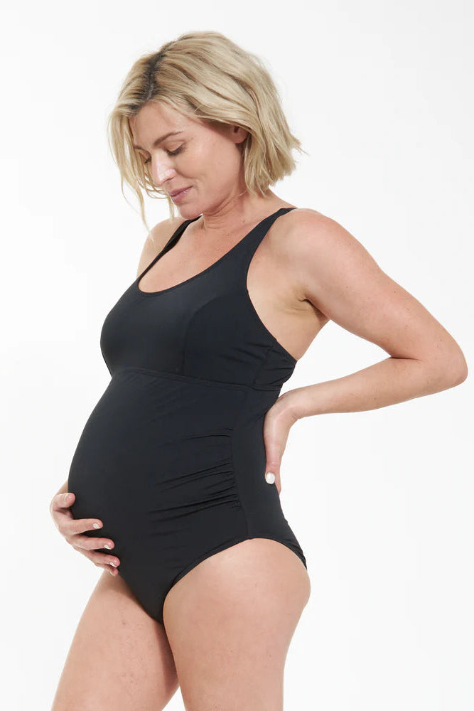 The Ultimate One Piece is made from chlorine resistant polyester for regular pool use. With adjustable straps and optional cross over at back, this one piece will take you through all the stages of pregnancy. Also features gathers at the tummy and removable bra cups.